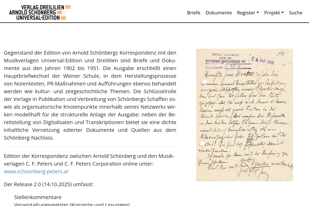 Catalogue of Digital Editions: Arnold Schönberg: Briefwechsel mit den Verlagen Universal-Edition und Dreililien, https://dig-ed-cat.acdh.oeaw.ac.at/entry-354.html